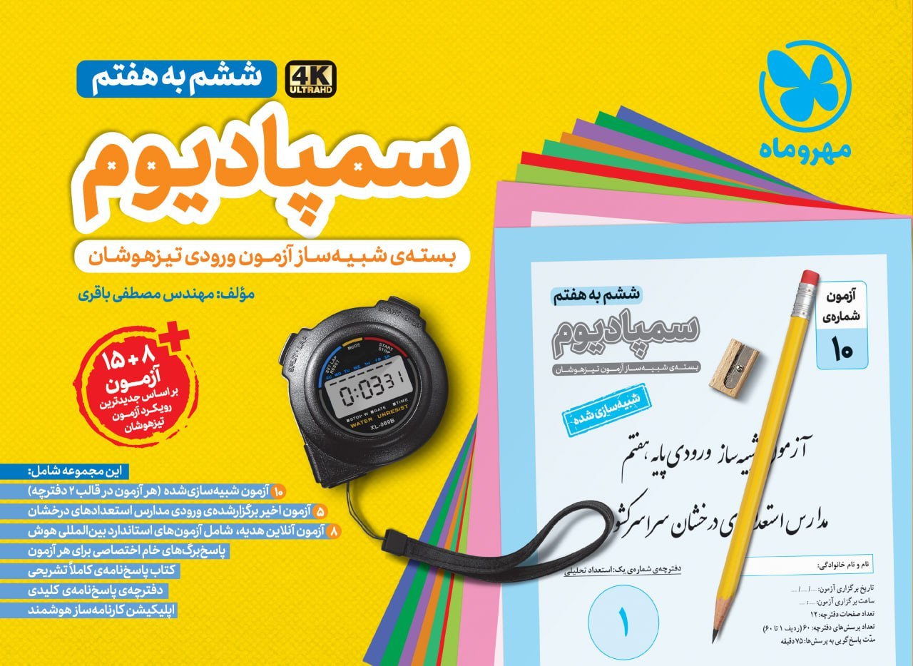 - کتاب سمپادیوم ششم مهروماه آزمونهایی که در سنوات گذشته برای ورود به پایهی هفتم و تکمیل ظرفیت همین پایه برگزار شده است، وجود دارد.